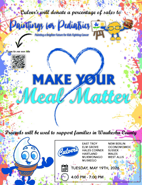 Please join us on May 19th for the Culver’s Make Your Meal Matter Event supporting Paintings for Pediatrics. A portion of the sales between 4:00pm and 7:00pm will go toward helping families ease the financial burden of medical bills, lost wages, lodging, and travel costs for families who have been hit with childhood cancer. Please mark your calendars and join us in helping families in need. You can also help by volunteering a few hours of your time at one of the participating restaurants. Please fill out a volunteer form and we will be in touch.